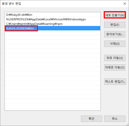 새로 만들기 > %JAVA_HOME%\bin 입력 > 확인