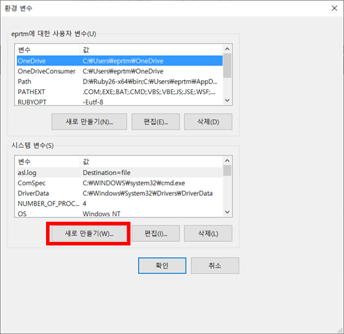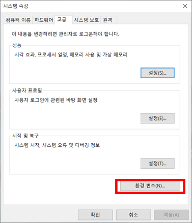 환경변수 > 환경변수 페이지로 넘어감