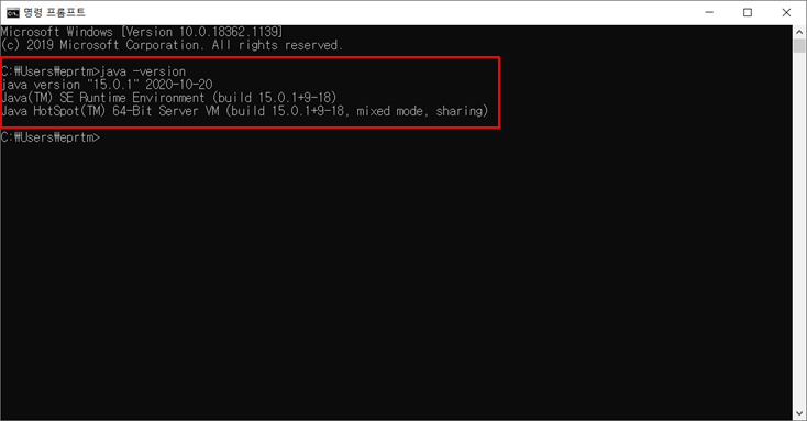 5. jdk가 정상설치된 경우 cmd 창에서 다음과 같은 결과가 나옵니다.