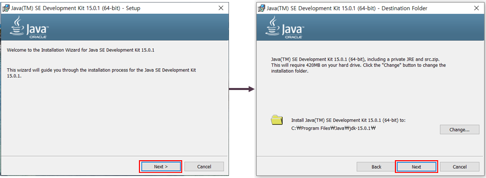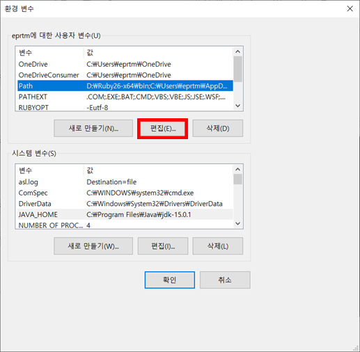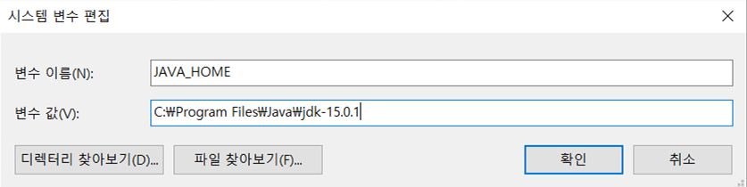 변수값(V) : jdk 설치된 경로 (ex: C:\Program Files\Java\jdk-15.0.1)
