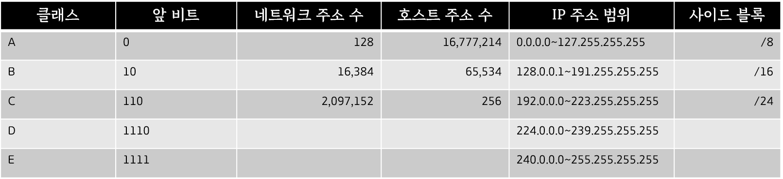 IP 주소를 적절히 분류한 것이 클래스이다. 클래스는 규모가 큰 조직에는 많은 호스트가 들어가고, 작은 조직에는 적은 수의 호스트가 들어갈 수 있게 주소를 여러 종류로 분류해서 제공한다.