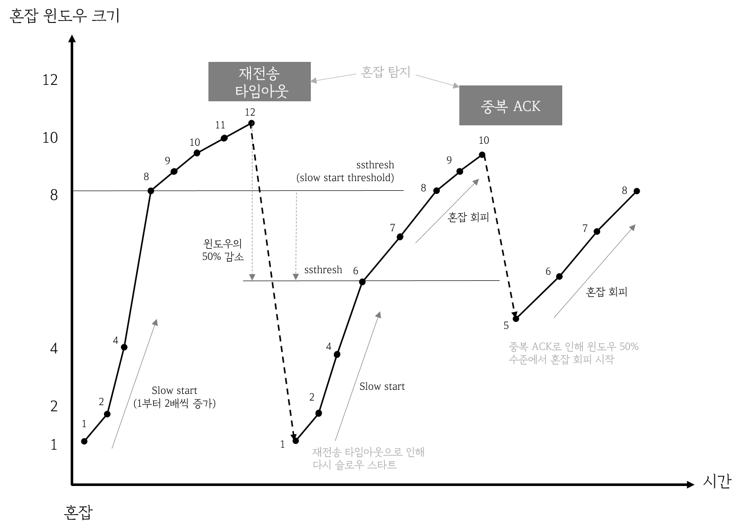 ssthresh(Slow start threshold)까지 슬로우 스타트 방식으로 증가하고 이후는 혼잡 회피(Congestion avoidance)로 1씩 윈도우를 증가시켜 나간다. 그러다가 재전송 타임아웃이나 중복 ACK에 의한 재전송이 발생하면 다시 혼잡 윈도우를 줄여 전송량이 줄어들도록 제어한다.