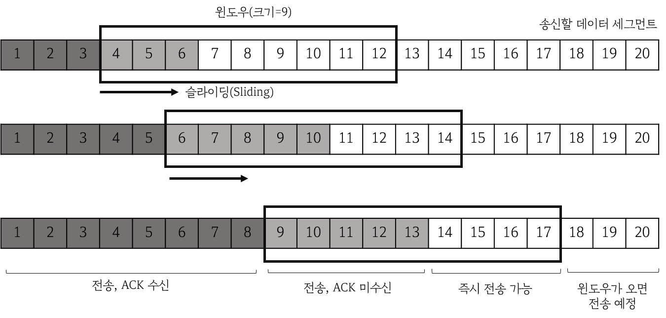 송신 윈도우는 ACK를 받기 전에 한번에 송신할 수 있는 최대량이다. 그리고 송신한 세그먼트에 대한 ACK가 도착하면 그만큼 윈도우에서 빠져나가고 그만큼 새롭게 전송할 수 있는 여유가 생긴다. 이렇게 동작하는 방식이 슬라이딩 윈도우(Sliding window)라고 한다.