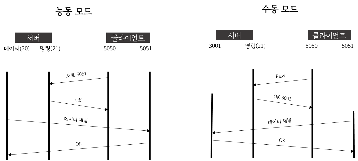 파일 전송용 연결을 맺을 때는 능동 모드(Active mode)와 수동 모드(Passive mode)라는 두 가지 방식으로 나뉜다.