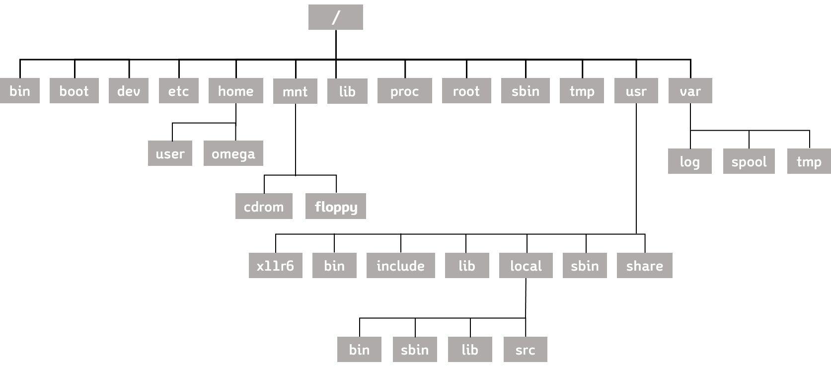 최상위 디렉터리(/)를 기준으로 하위 디렉터리들이 존재하는 계층적 트리 구조로 구성되어 있음.