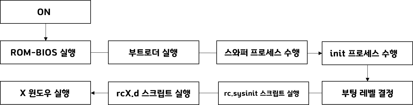 우선 전원이 켜지고 나면, ROM-BIOS를 실행하여 POST와 부트로더를 로딩한다. 그리고 부트로더를 실행하여 커널로드와 스와퍼 프로세스를 호출한다. 리눅스 부트로더는 LILO와 GRUB를 사용한다. 부트로더를 통해 리눅스 커널을 로딩하고 커널을 선택하여 메모리가 로드되는 순간부터 부팅이 진행된다. 스와퍼 프로세스가 실행되고 init 프로세스가 실행하여 파일 /etc/inittab을 읽어 들인다. 부팅레벨을 결정하고 /etc/rc.d/rc/sysinit 스크립트를 실행하여 시스템 초기화 작업을 실행한다. 이어서 /etc/rc.d/rcX.d 스크립트가 실행되어 부팅 레벨에 대해 디렉터리 내의 스크립트가 순차적으로 수행된다. 부팅레벨이 5일경우 GUI 사용자 환경으로 X-윈도우를 실행한다.