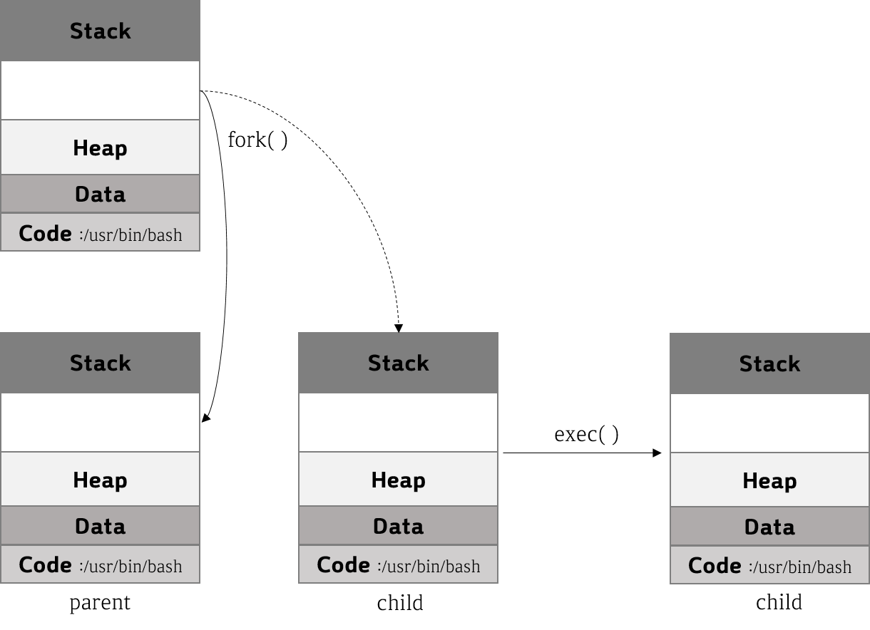 fork( ) : 새로운 프로세스를 만들 때 기존 프로세스를 복제하는 방식. 새로운 프로세스를 위한 메모리를 할당한다. 원본 프로세스를 parent process라고 부르고, 새로 복제된 프로세스를 child process라고 부른다.