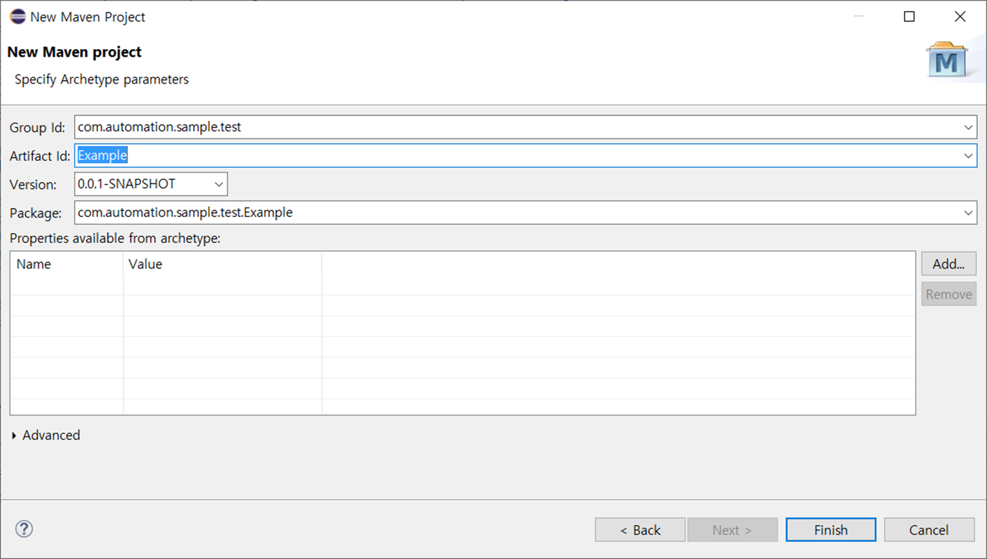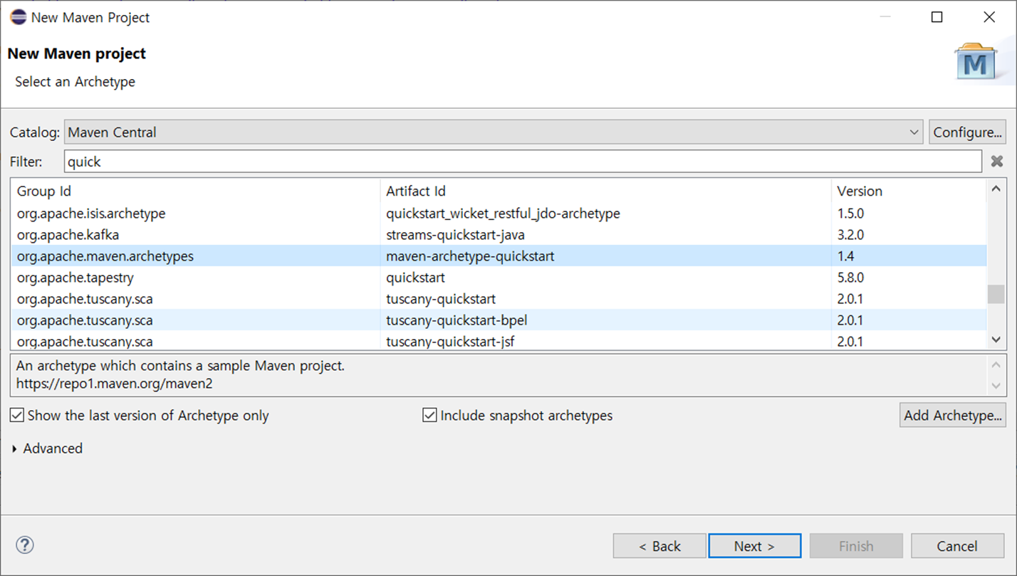 아카이브 타입은 일종의 템플릿이라고 보면 되는데, 본인이 사용하고 싶은 특수한 아카이브가 있는게 아니었기 때문에 maven-archetype-quickstart를 사용했습니다. 해당 메이븐에서 용도에 맞게 조금씩 바꾸어 사용하려고 합니다.