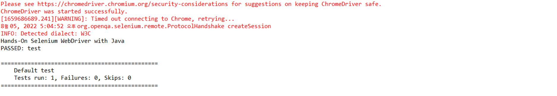 그리고 test에서 테스트 코드를 작성해 돌려보면, 따로 경로를 지정하지 않아도 webdrivermanager를 이용해 chromedriver를 사용할 수 있습니다.