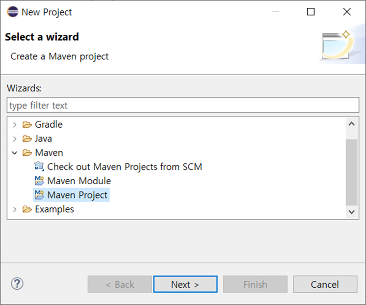 새롭게 Maven Project로 만들어주고, Workspace 위치를 지정해준 다음, 아카이브 타입을 선택해줍니다.