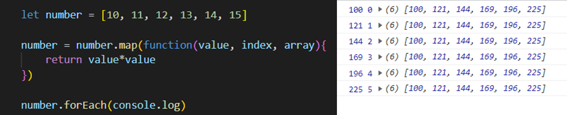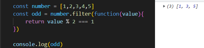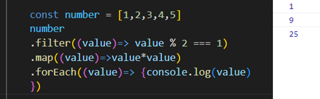 이렇게 화살표 표시(=>)를 이용해서 함수를 사용가능하다. 그리고 해당 코드는 number에 filter를 사용해 홀수 값만 걸러내서 제곱한 숫자를 출력해주는 코드이다. 이렇게 메소드 리턴값을 기반으로 함수를 연이어서 사용하는 것을 메소드 체이닝이라고 한다.
