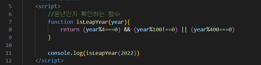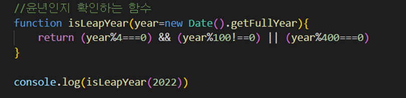 위와 같은 예시처럼 매개변수 year을 이용해서 윤년인지 확인하는 함수를 만들 수 있다. 리턴값으로는 2022년 윤년이 아니므로 false값을 받게 된다.