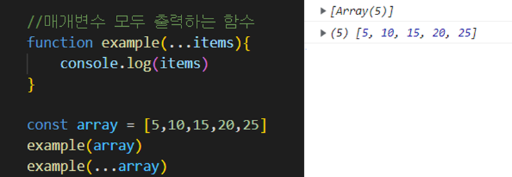 예시 코드를 보면 전개 연산자를 사용하지 않으면 배열이 매개변수로 들어오고, 전개 연산자를 사용한 경우에는 숫자 하나하나가 전개되어 매개변수로 들어온다.