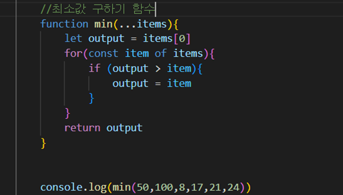 위와 같은 최소값 구하는 함수가 있다고 하면, items라는 나머지 매개변수를 이용해서 배열처럼 사용해 최소값을 구할 수 있다.