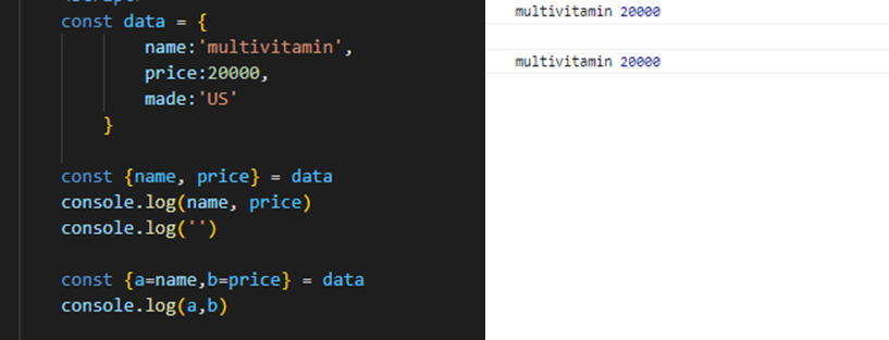 객체 내부에 있는 속성을 꺼내서 변수로 할당할 때 다음과 같이 사용할 수도 있다.