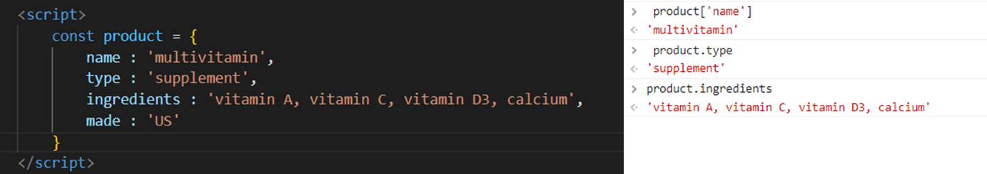 위처럼 객체를 선언해보면, 대괄호나 온점(.)을 사용해서 값으로 접근할 수 있다.