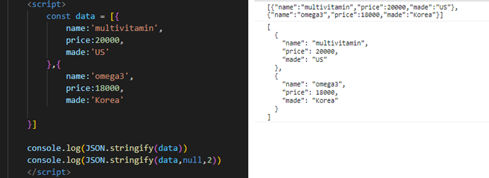 JSON.stringify() 메소드를 사용하면 자바스크립트 객체를 JSON 문자열로 변환할 수 있다. 반대로 JSON 문자열을 자바스크립트 객체로 전개할 때는 JSON.parse() 메소드를 사용한다.