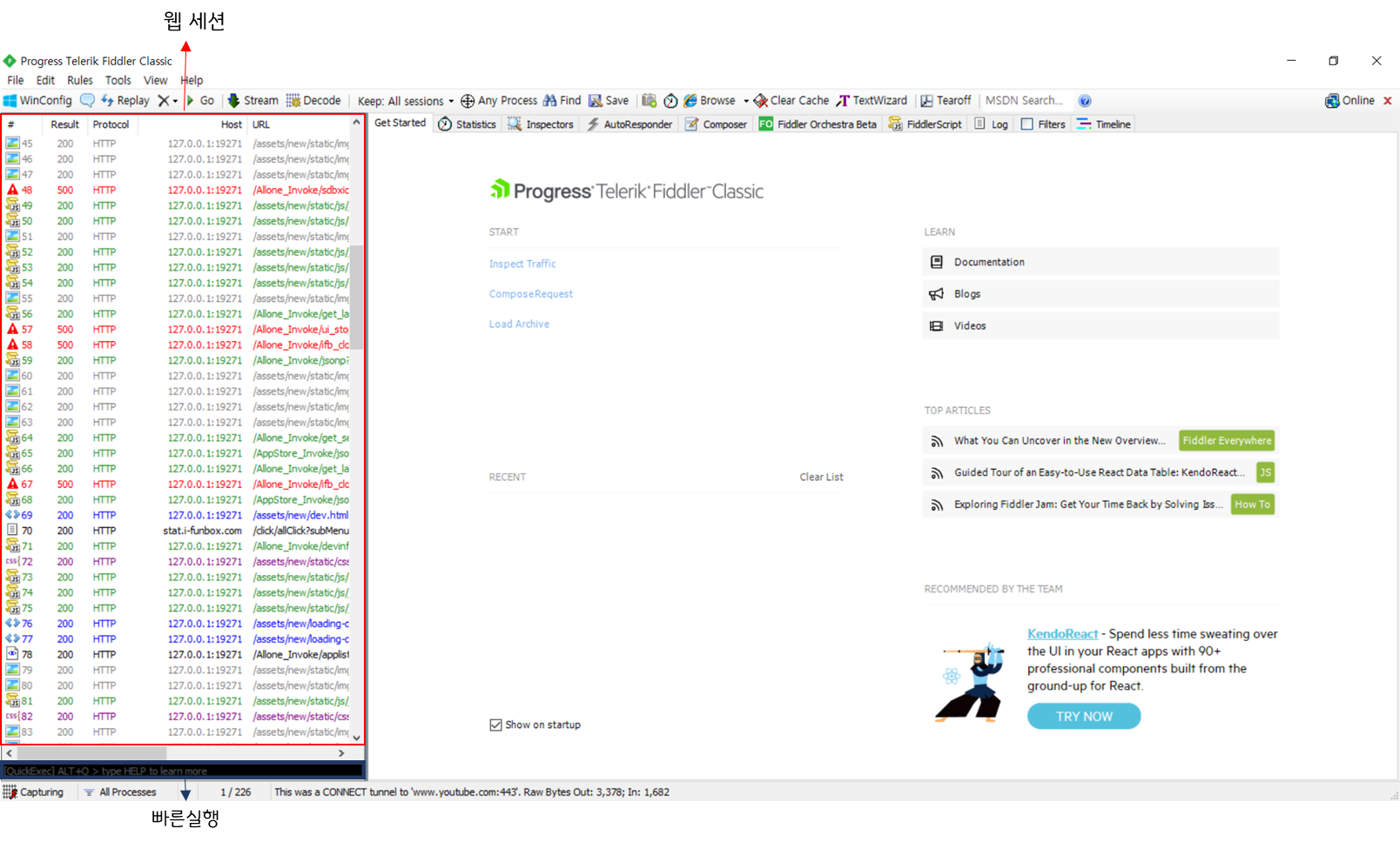 피들러 창의 왼쪽 영역은 웹 세션 목록이고, 오른쪽에는 웹 세션 목록에서 선택한 세션에 대한 다양한 정보를 보여주는 여러 종류의 탭을 포함하고 있다.