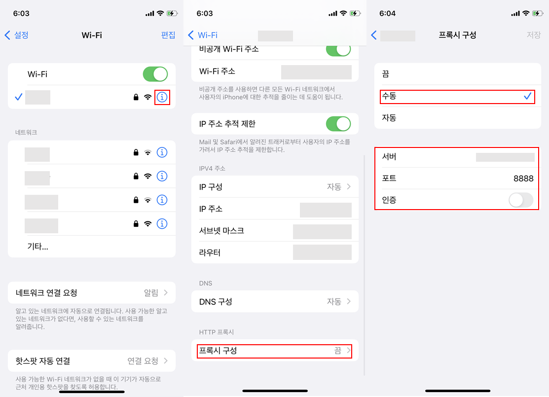 모바일 기기에서는 ios의 경우, 와이파이 설정을 변경해야 한다.
