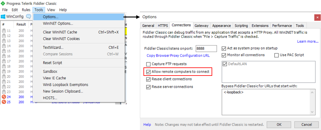 WIFI또는 이더넷을 지원하는 대부분의 기기들은 자신의 트래픽을 피들러로 보낼 수 있다. 먼저 외부 트래픽을 받을 수 있도록, fiddler Tools > Options > Connections > Allow remote computers to connect를 설정한다.