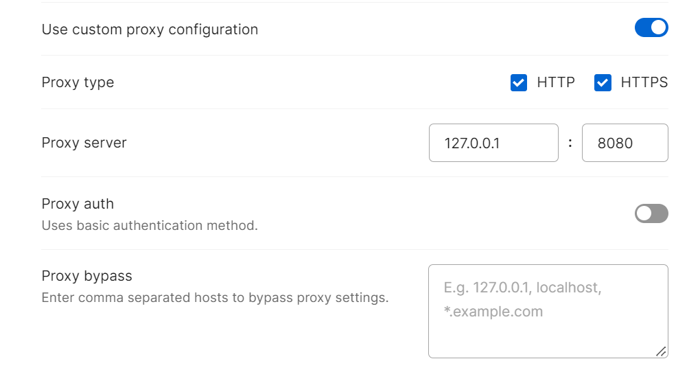 3. Burp Suite 프록시를 사용할 사용자 지정 프록시로 지정한다. Use custom proxy configuration을 토글키로 연 다음, Proxy Server 박스에서 Burp Suite가 사용 중인 프록시 서버의 IP 주소를 입력한다.