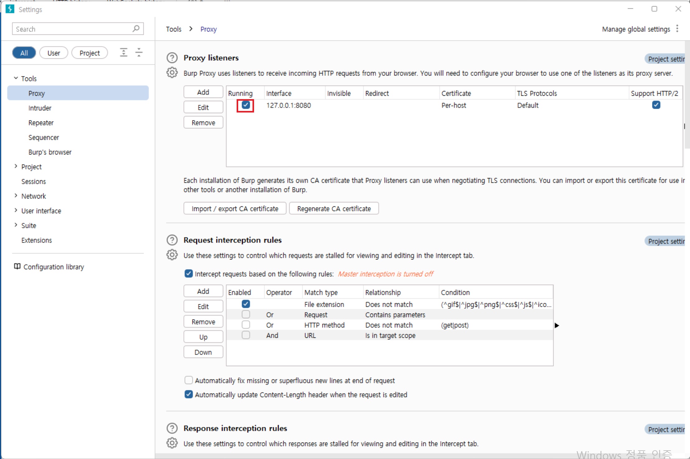 2. Proxy Listeners 섹션에서 running 체크박스에 체크되어 있는지 확인한다.(127.0.01:8080)
