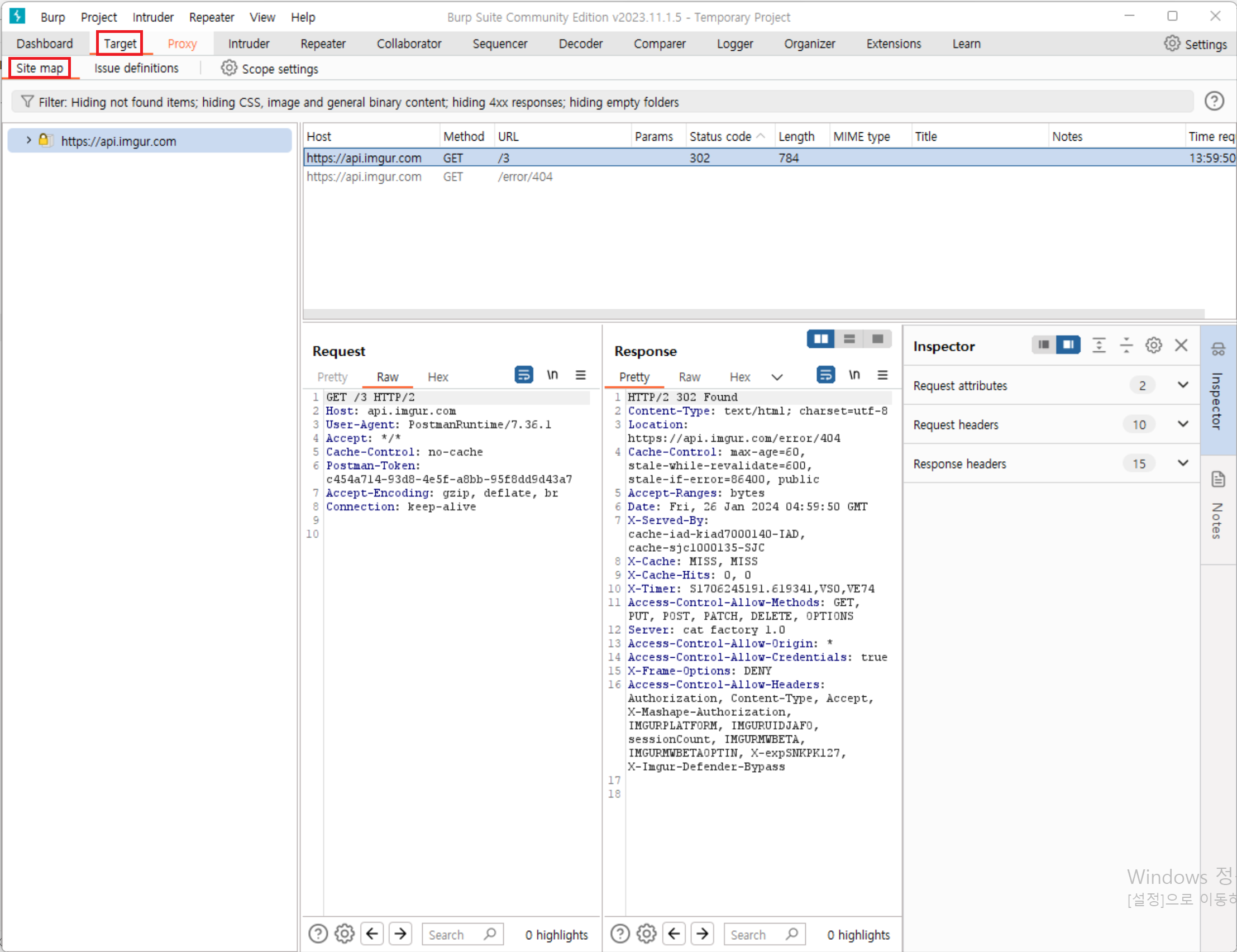 Target > Sitemap 탭을 선택하면 여기서 API request 세부정보를 확인할 수 있다.