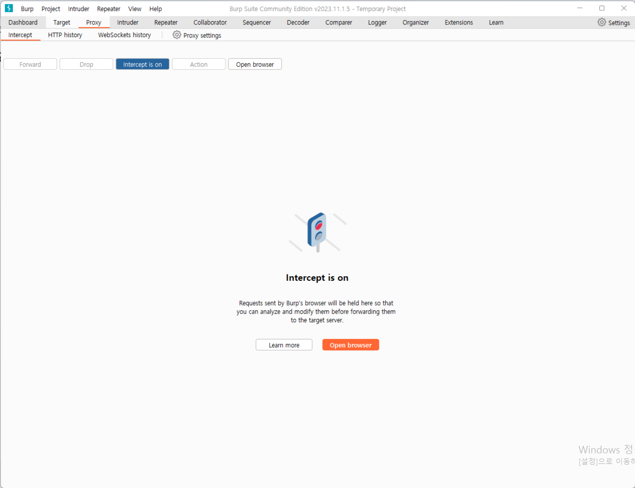 3. Intercept 서브탭에서 Intercept is on 버튼을 클릭하면 인터셉팅이 켜진다.