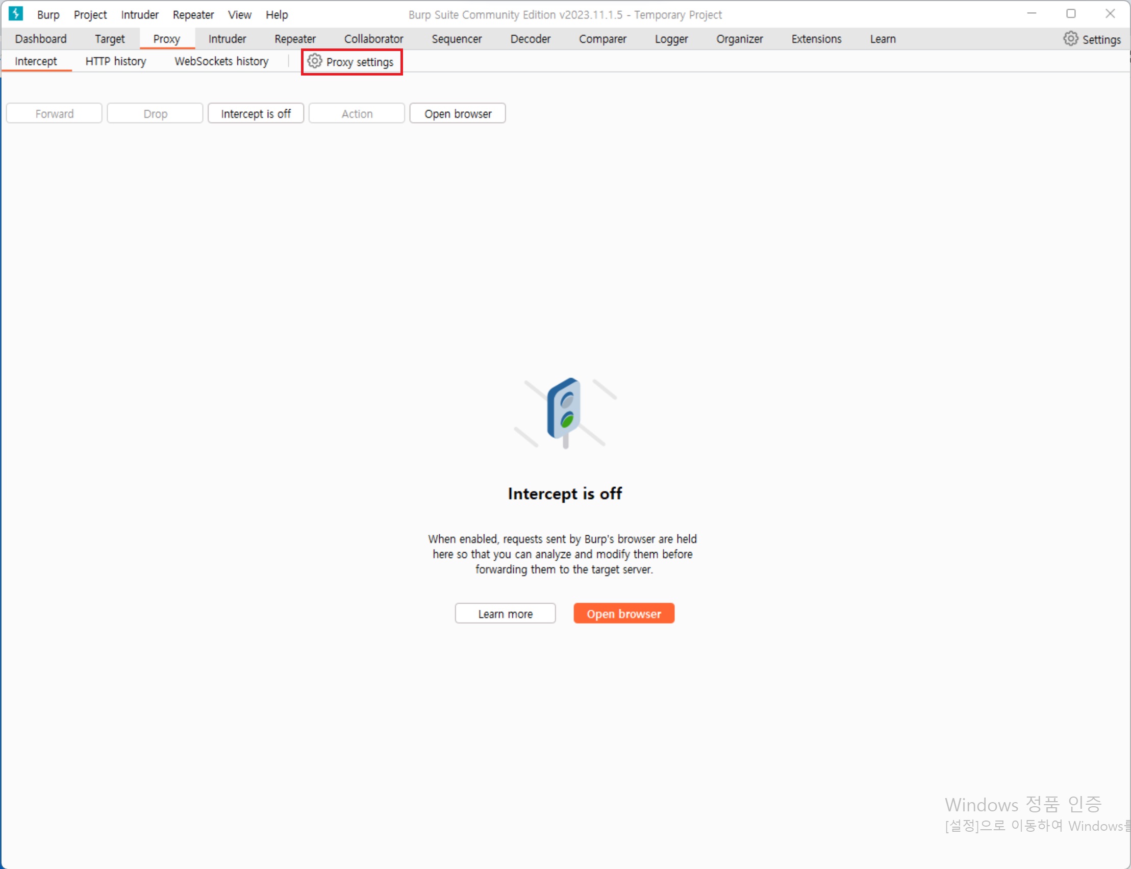 1. Proxy tab > 서브탭에 있는 proxy settings를 선택해서 창을 열어준다.