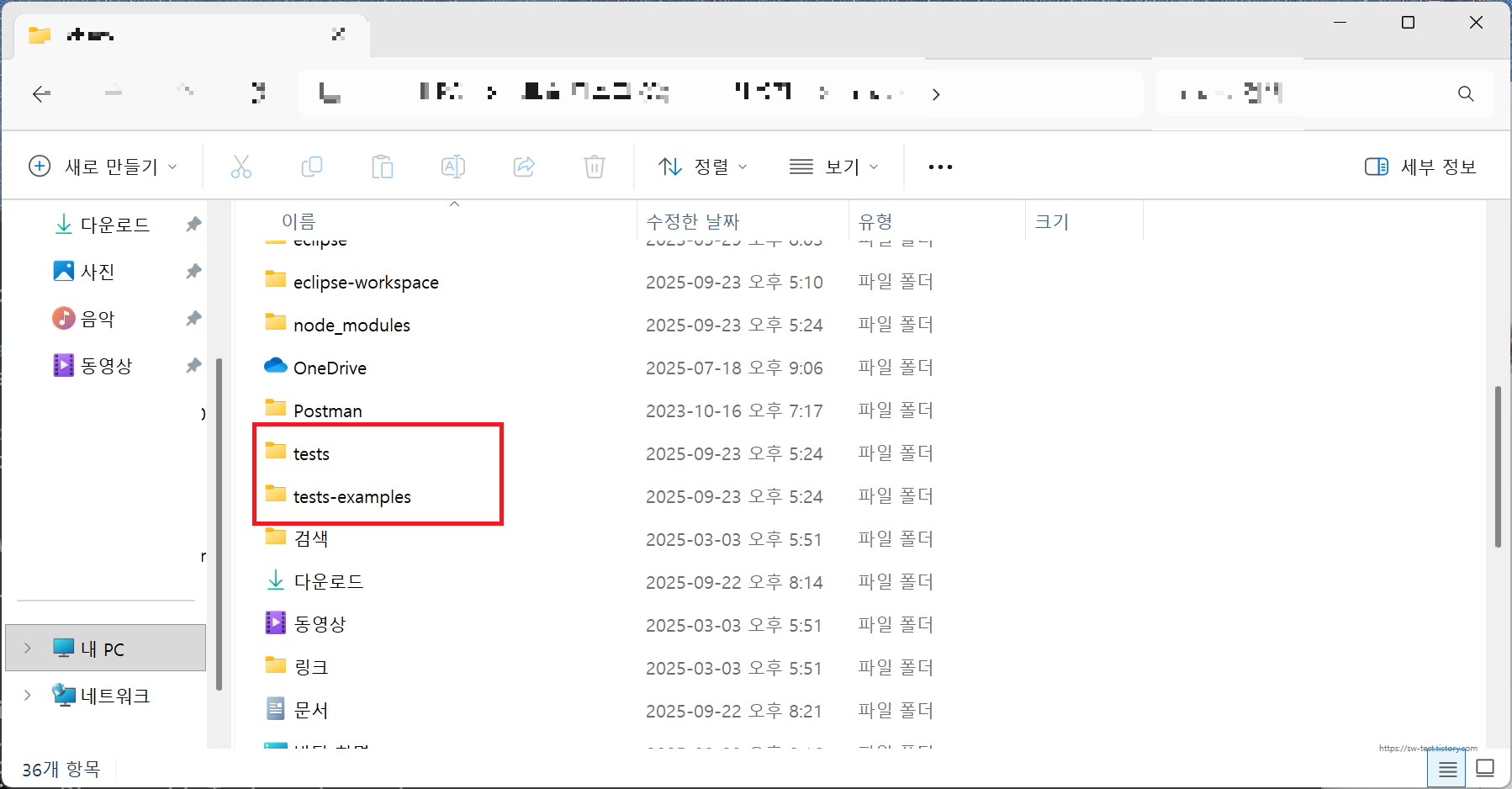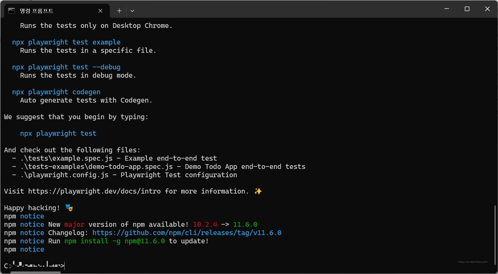 cmd창에서 다운로드가 끝나면 해당 명령어를 수행한 폴더 위치에 tests, tests-examples라고 파일들이 설치되면 완료입니다!