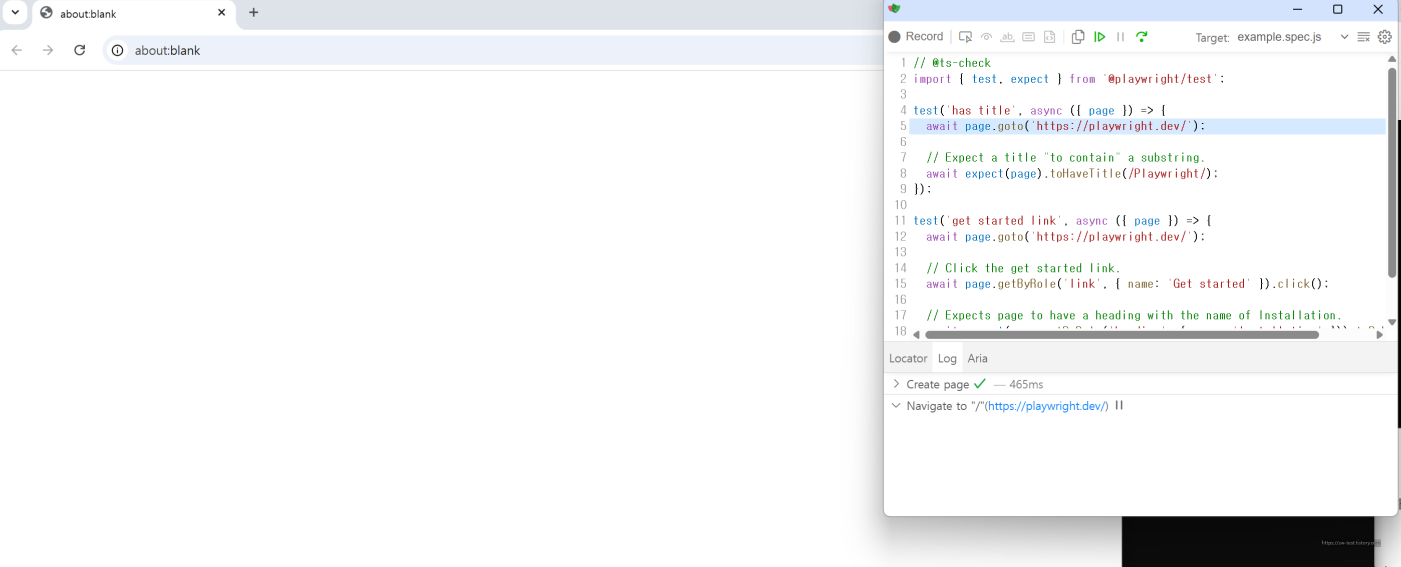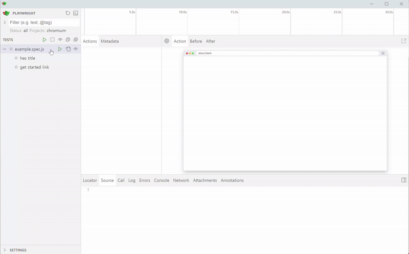 tests 폴더 안에는 example.spec.js 파일이 하나 들어있습니다. 위의 명령어를 입력하면 Playwright가 UI모드로 해당 파일을 테스트할 수 있게 창이 뜹니다. 해당 UI모드 창이 뜨면 RUN을 돌려보면 예제파일에 들어있는 페이지가 제대로 로드되고 제목이 맞는지와 사용자가 링크가 있는 버튼을 클릭했을 때 이동되는지에 대한 테스트문이 실행됩니다.