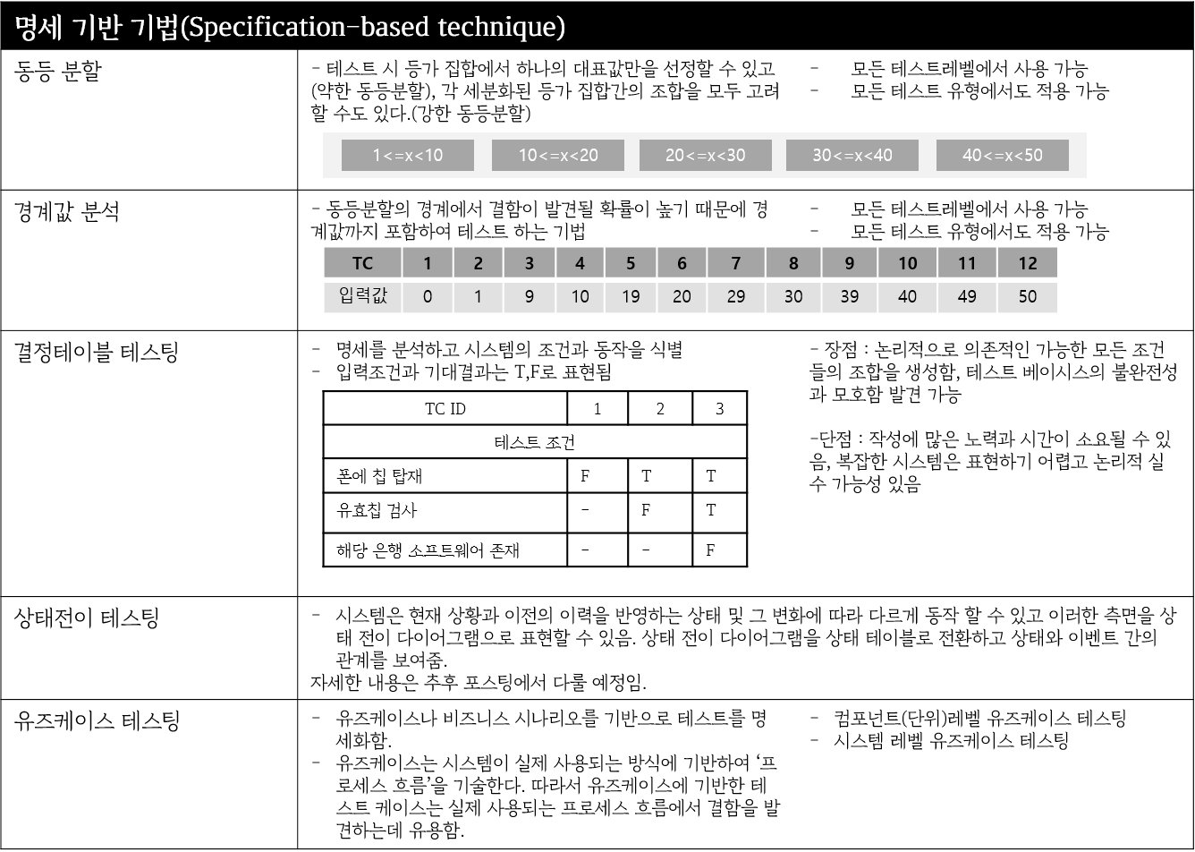 블랙박스 기법(명세기반 기법과 경험기반 기법을 포함함) : 테스트 대상의 내부구조(코드)를 참조하지 않고 테스트 베이시스, 개발자와 사용자들의 결험을 바탕으로 기능적 혹은 비기능적 테스트 케이스를 도출하고 선택하는 방법이다.