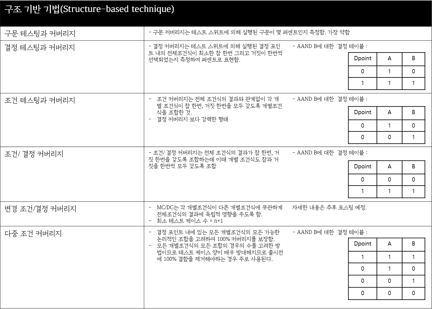 - 커버리지를 측정할 수 있으나 그 의미가 구조기반 기법의 커버리지에 비해 제한적이다. (상태전이 커버리지, 결정 테이블 커버리지, 요구사항 커버리지 등)
