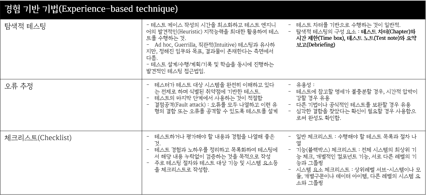 - 테스트 관련 인력의 지식이나 경험으로 테스트 케이스를 도출한다.