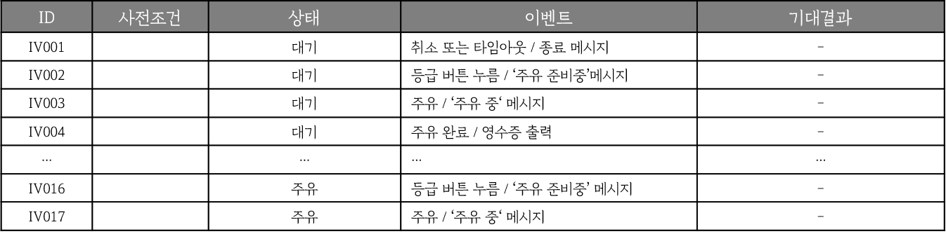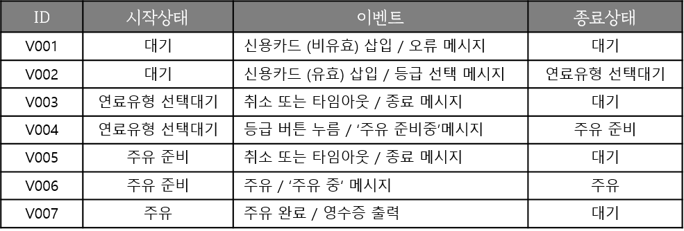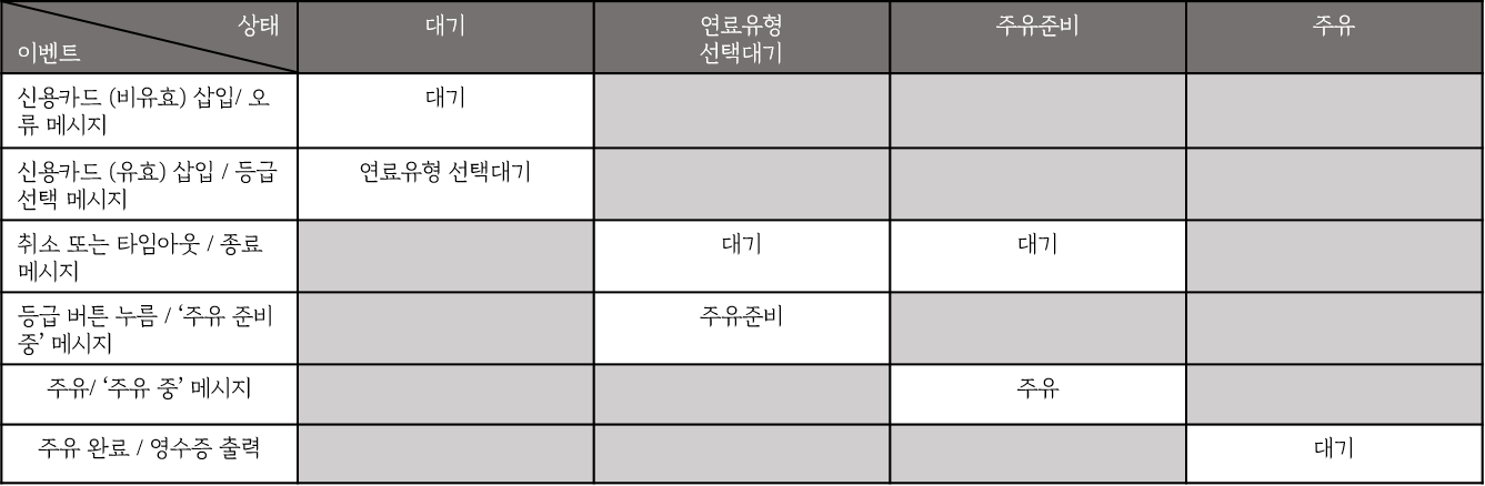 상태 다이어그램의 모든 상태와 이벤트를 테이블로 구성하면 아래와같다. 이때, 모든 상태와 이벤트를 테이블에 그 관계를 표현한다는 것은 상태 전이 커버리지를 달성하는 모든 '전이'를 테이블의 셀에 나타내는 것을 의미한다. 즉, 해당 이벤트에 의해 해당 상태가 다른 상태로 전이되는 모든 경우를 표현하는 것이다.