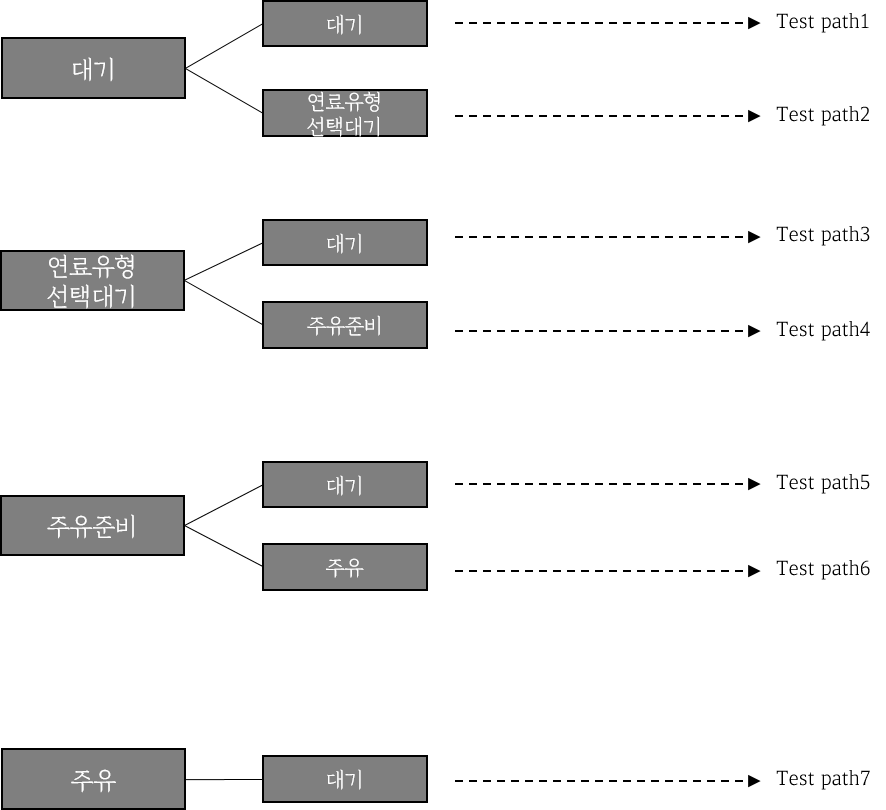 전이 트리에서 상태가 이벤트에 의해 전이되는 모든 경로를 테스트 케이스로 전환해보면 다음과 같다.